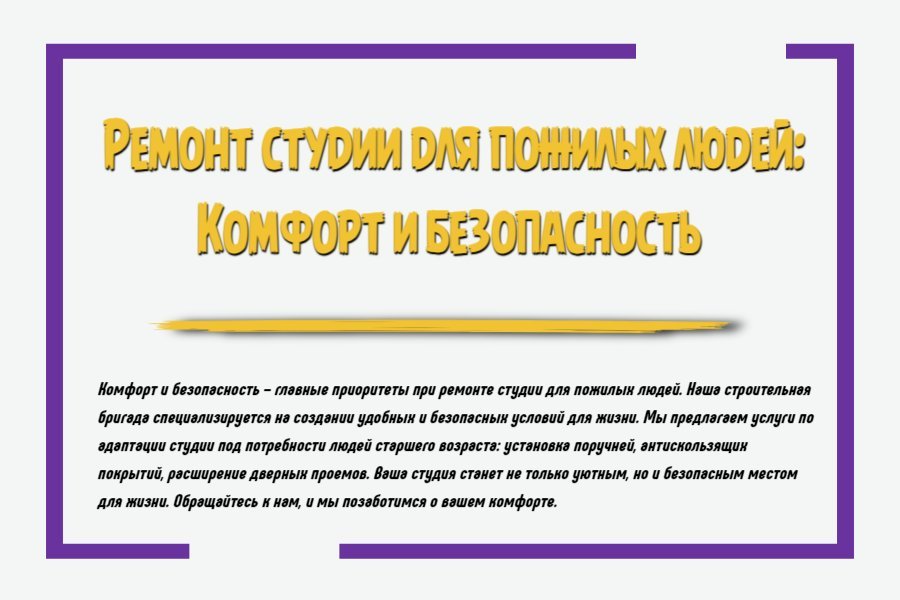 Ремонт студии для пожилых людей требует особого подхода, учитывающего их потребности в комфорте, безопасности и удобстве. Важно создать пространство, которое будет поддерживать активный образ жизни, обеспечивая при этом максимальную независимость и безопасность.